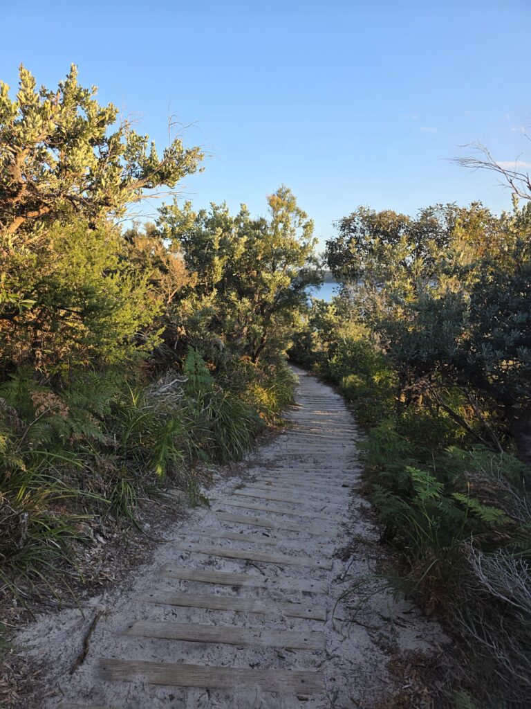 开车十分钟,走路半小时。小红书上说“15分钟小路到海边”,结果是上坡下坡连环套餐。因为我穿的鞋底不够厚,路上铺满的石子,以及下坡路时沙地上铺了木条当台阶,硌得我脚底生疼。
