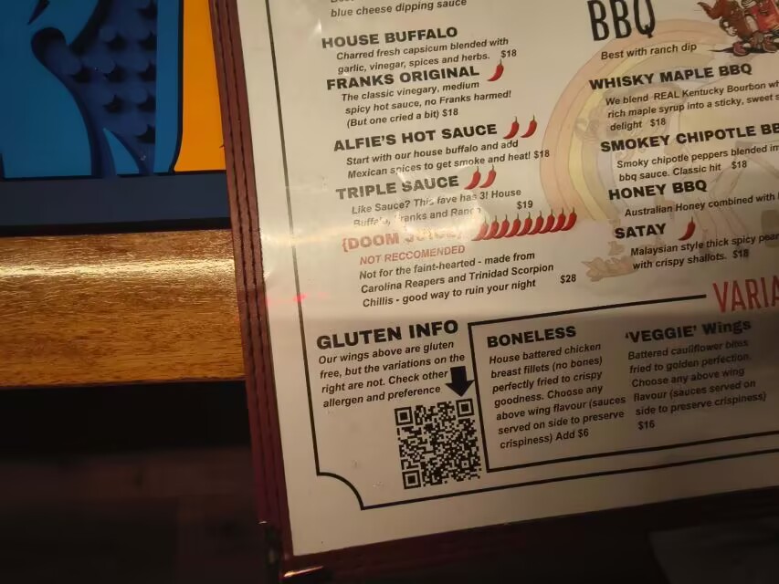也就是在菜单上,我看到了那个画满辣椒、写着“Good way to ruin your night”的 {DOOM JUICE}。作为一个在澳洲待了挺久、见惯了这边🌶符号=挂件的人,我当时内心是有点不屑的。