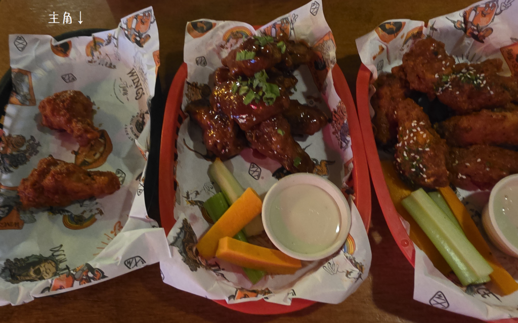 但又怕过辣吃不完,所以不敢直接点28刀一整份(一开始以为是28刀7个),在问了之后才弄明白——28刀并不会给7个超辣鸡翅,而是6个其他随机鸡翅,然后再将这个超辣鸡翅混在其中(所以28刀也只是一个)。因为不想吃不完,我们没点那个28刀的“左轮手枪”拼盘,而是单独花了10刀买了两个“挑战”一下味道。